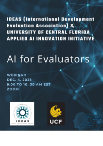 We are pleased to announce our upcoming webinar, AI for Evaluators, co-organized by IDEAS and the University of Central Florida, Applied AI Innovation Initiative.
